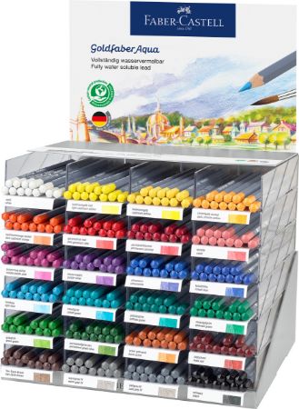 Display cu 288 de creioane colorate Aquarelle Goldfaber Faber-Castell. Creioane colorate aquarelle cu mina de 3.3 mm intens pigmentata, rezistenta la lumina excelenta, culori vibrante, moi. Sunt complet solubile in apa. Mina rezistenta la rupere. Usor de ascutit. Tehnologie noua, inovativa. Poti lucra mai precis cu creioanele tip acuarela fata de acuarelele traditionale la tub care se usuca cu usurinta si lasa In urma pete nedorite. Cu pensula umeda creezi un efect de acuarela incredibil.
