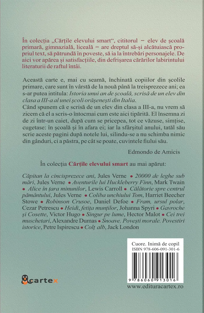 Edmondo de Amicis este unul dintre cei mai cunoscuti scriitori, jurnalisti si pedagogi italieni din a doua jumatate a secolului al XIX-lea. Celebritatea sa este castigata pe termen lung gratie volumului Cuore. Inima de copil, o carte pentru copii prezentata ca un jurnal al unui elev italian. \nLucian Pricop